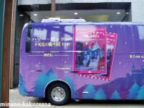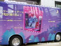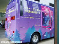 不死鳥の騎士団ラッピングバス。v 本屋さんに、ラッピングバスがいました〜。v 紫色で、かわいいバス。v 街中を走ったり、してるのかしら? 近くでイベントらしきものをやってたみたいだけど、 雨だったせいか、あんまり人がいなかったわ〜。 2004/9/5 |