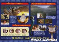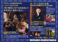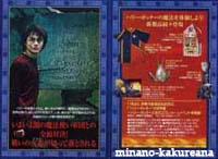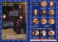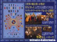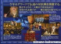 GoF映画版攻略ガイド。v 映画館に、GoFのチラシ&攻略ガイドがありました。v チラシの表紙になってる、白い煙に浮かぶハリーが素敵。* 攻略ガイドの方では、ハーマイオニーの他、 フラーやチョウのドレス姿も ちょこっと載ってるわ〜。v 星が散ってるポスター。* あれはワールドカップのポスターなのかな〜♪ ああ! ジャパンも入っている〜!(笑) うう〜ん。 そして、ダークマークと墓地のシーンも。/// キャラクターでは、クラウチジュニアが印象的。 水から上がったシーン?のハリーにドキドキしつつ。/// 驚いたのが、 お風呂のシーン!*///(笑) 火を噴くドラゴンの左下に載ってます〜。* これはさすがにカットされるだろうと思ってたのに、 まさかあるとは。。 ほんとに泡風呂だわ〜。*/// ハリーファンとしては、ドキドキ。。*(笑) なんだかほとんど原作の通りな気がする。 こんなにたくさんシーンがあって、 時間足りるのかな〜? しかし原作ファンとしては、嬉しいな〜。* 2005/9/22 |