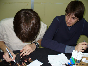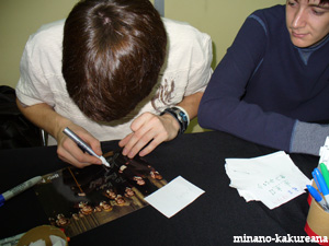 フェルプス兄弟サイン会。* フェルプス兄弟のサイン会に行って来ました〜♪ 会場はこじんまりとして、 なんだかアットホームな感じ。/// 来ていた方も意外に少数。 とはいえ、ものすごく緊張〜!///^^ 二人ともとっても素敵です。* なんだか映画で観たまんまでした。v サインは左が、ジェームズ・フェルプスさん、 右がオリバー・フェルプスさん。 そして、サインしてくださっているところ。v すごく真剣に書いて下さっています〜。///(感激。v) 書いてくださったお名前からして、 左、白い上着が、ジェームズさん、 右、青い上着が、オリバーさん。 正直、見た目では区別つきません。/// そっくり〜!///^^ ジェームズさんが、フレッド役。 オリバーさんが、ジョージ役です。 うう〜ん。とても見分けられない〜。* 2005/11/26 ・ ・ ・ ・ ・ ・ ・ ・ ・ ・ ・ ・ ・ ・ ・ ・ ・ ・ ・ ・ ・ ・ ・ ・ ・ ・ ・ ・ ・ ・ ・ ・ ・ ・ ・ ・ ・ ・ ・ |